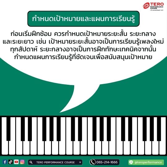 ก่อนเริ่มฝึกซ้อม ควรกำหนดเป้าหมายระยะสั้น ระยะกลางและระยะยาว เช่น เป้าหมายระยะสั้นอาจเป็นการเรียนรู้เพลงใหม่ทุกสัปดาห์ ระยะกลางอาจเป็นการฝึกทักษะเทคนิคจากนั้นกำหนดแผนการเรียนรู้ที่ชัดเจนเพื่อสนับสนุนเป้าหมาย